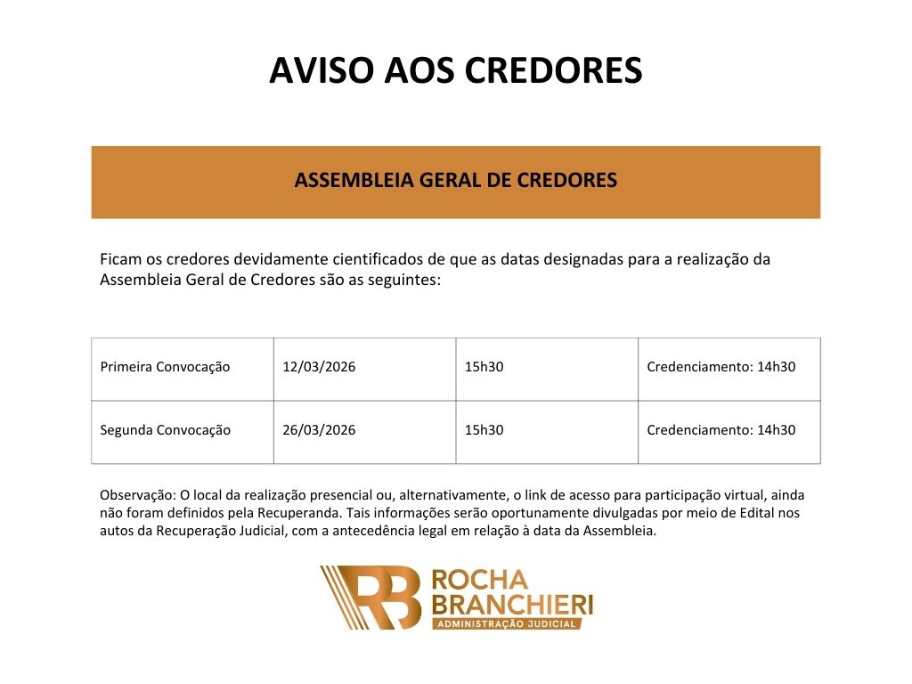 Fase atual: Aguardando realização da Assembleia Geral de Credores, destinada à deliberação do plano de recuperação judicial.